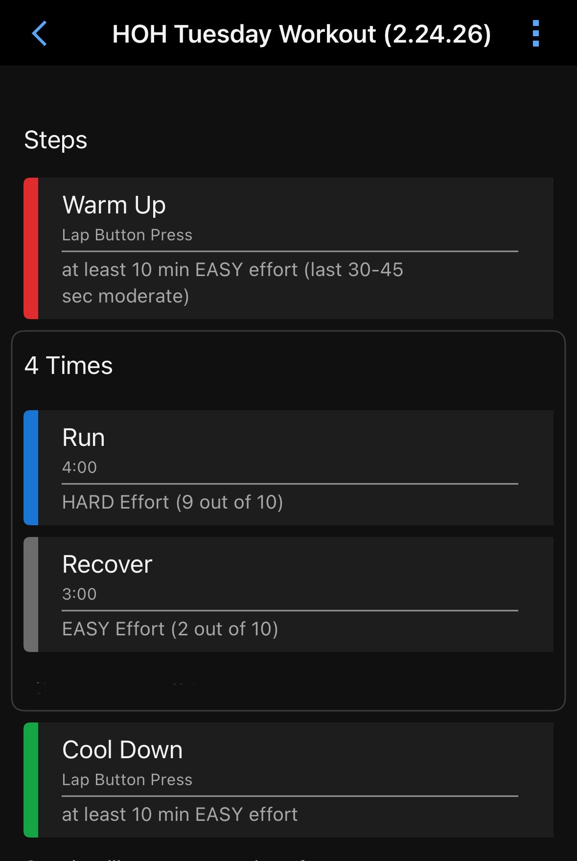 Cooldown: at least 10 min easy effort